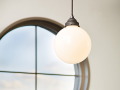 乳白色のガラスグローブとシックなボディの組み合わせがレトロで個性的な単語ペンダントライト。