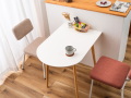 シンプルでコンパクトサイズのダイニングテーブル。1辺に曲線を入れたフォルムでオーバルテーブルのような雰囲気を出しつつ、片面を壁付けして使用する事が出来ます。