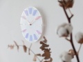 アクリルのインデックスが光を受けて虹色に反射し、空間にやさしい彩りを添えるウォールクロック。