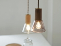 木のソケットカバーと厚みのある末広がりのガラスシェードで作られた、温かみのあるデザインが魅力のペンダントライトです。