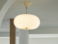 丸みのあるオーバル型のガラスシェードを少しくぼませることで、うっすらと影が落ち、立体感が生まれました。緩やかにくぼんだシェードの先端には小さなウッドボールを配置し、ナチュラルなワンポイントになっています。