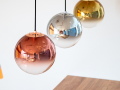 ガラスの表面メッキを施したオブジェのようなキューダペンダントライト。鏡面化したメッキは鏡のように光を反射するので周りのインテリアが映り込みます。