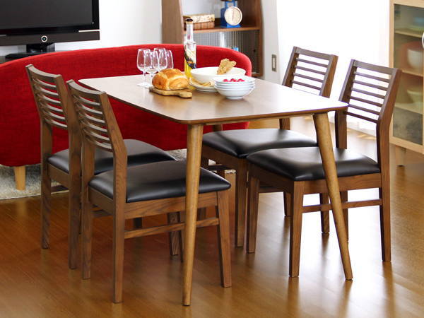 ウォールナットの木目が美しいテーブルは4人で使用するちょうどいいサイズ。