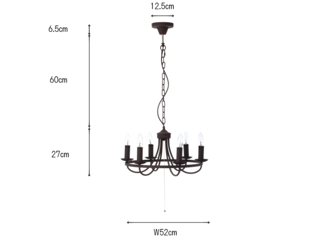 *電球選択時の付属電球: 【白熱球】 E17/40W シャンデリア球×6 *LED球使用可能 *口金サイズ:E17 *最大消費電力:40W(1灯あたり) *スイッチ:プルスイッチ(3灯→3灯(別の3灯)→6灯→消灯) *取り付け:引っ掛けシーリング *発送まで2.3日お時間を頂いております。 |