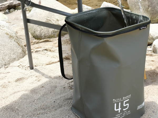 メッシュのフタが付いたマルチバスケットは、アウトドアでは水にも強いので小物入れやグッズ収納としてとして使用すると便利です。